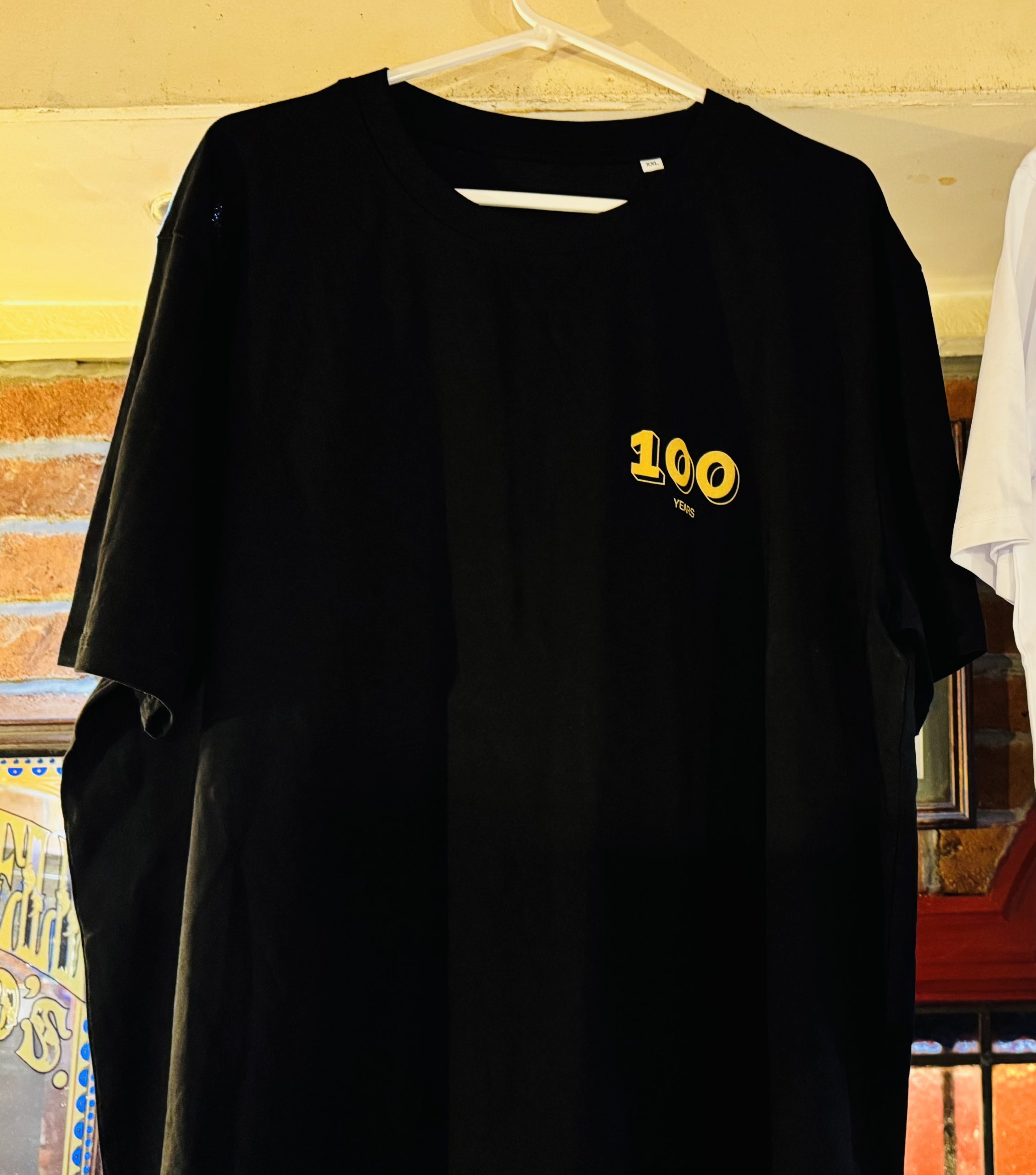 Black 100 Years T-Shirt with Front “100 Years” print and “We’re still standing” print on back.