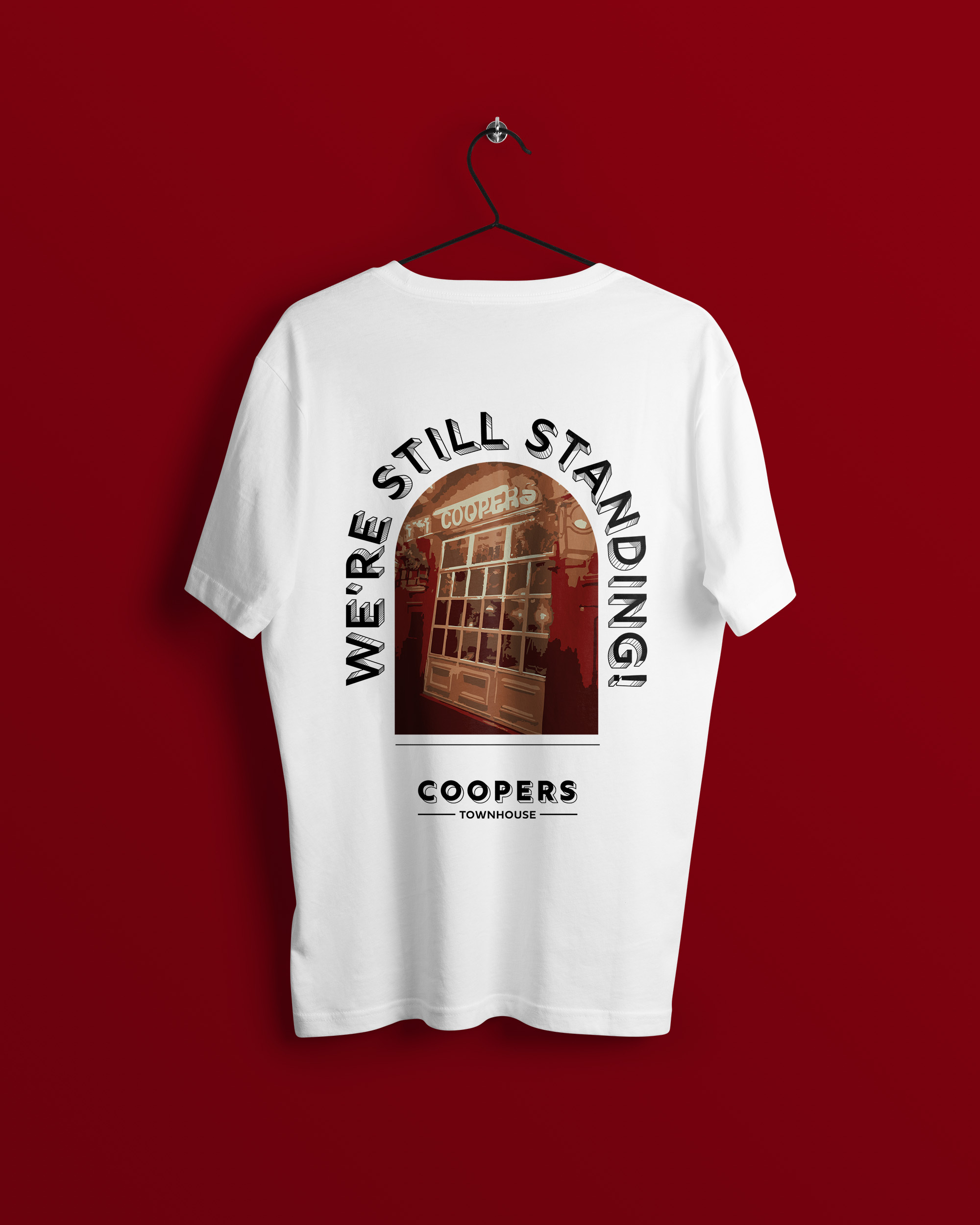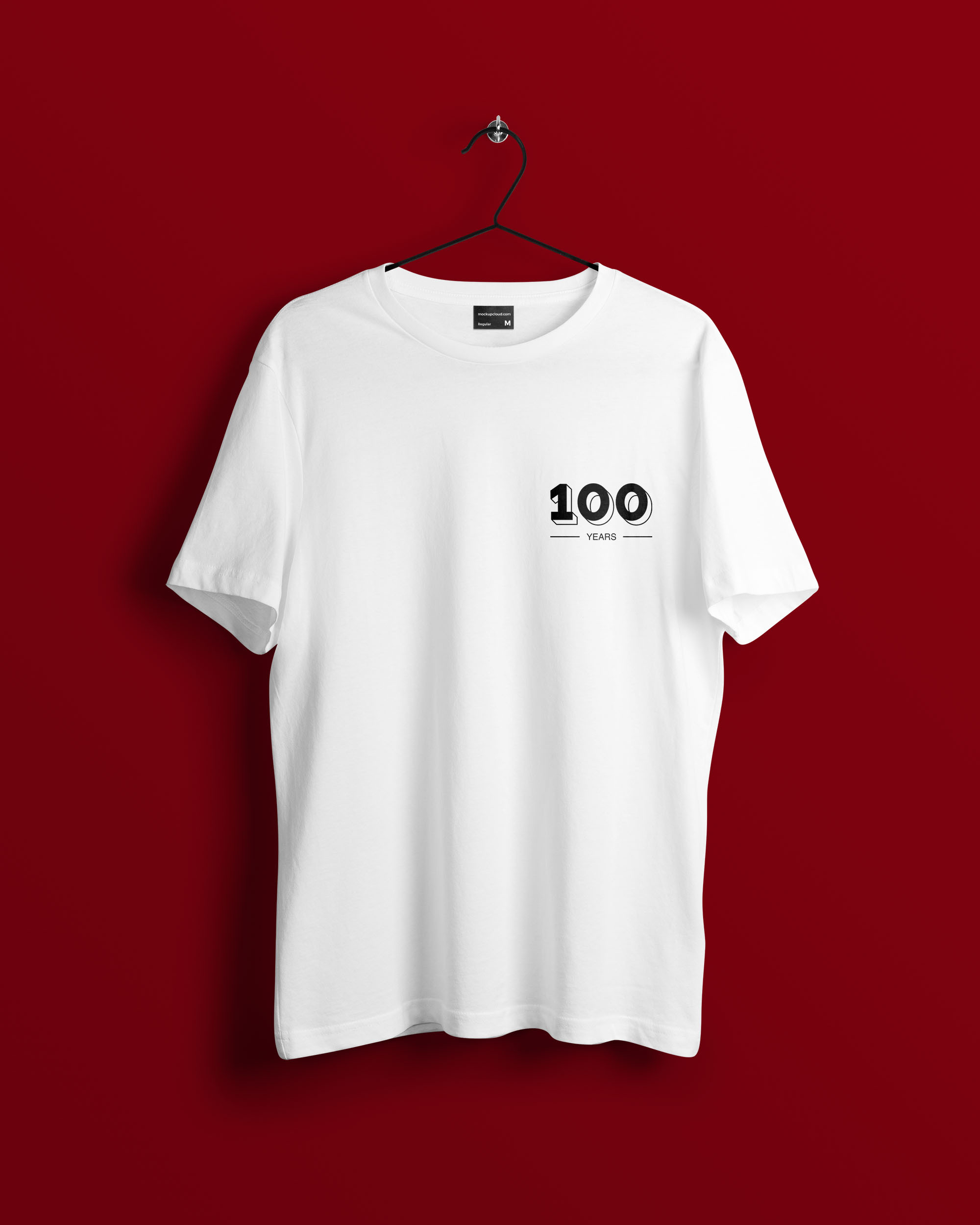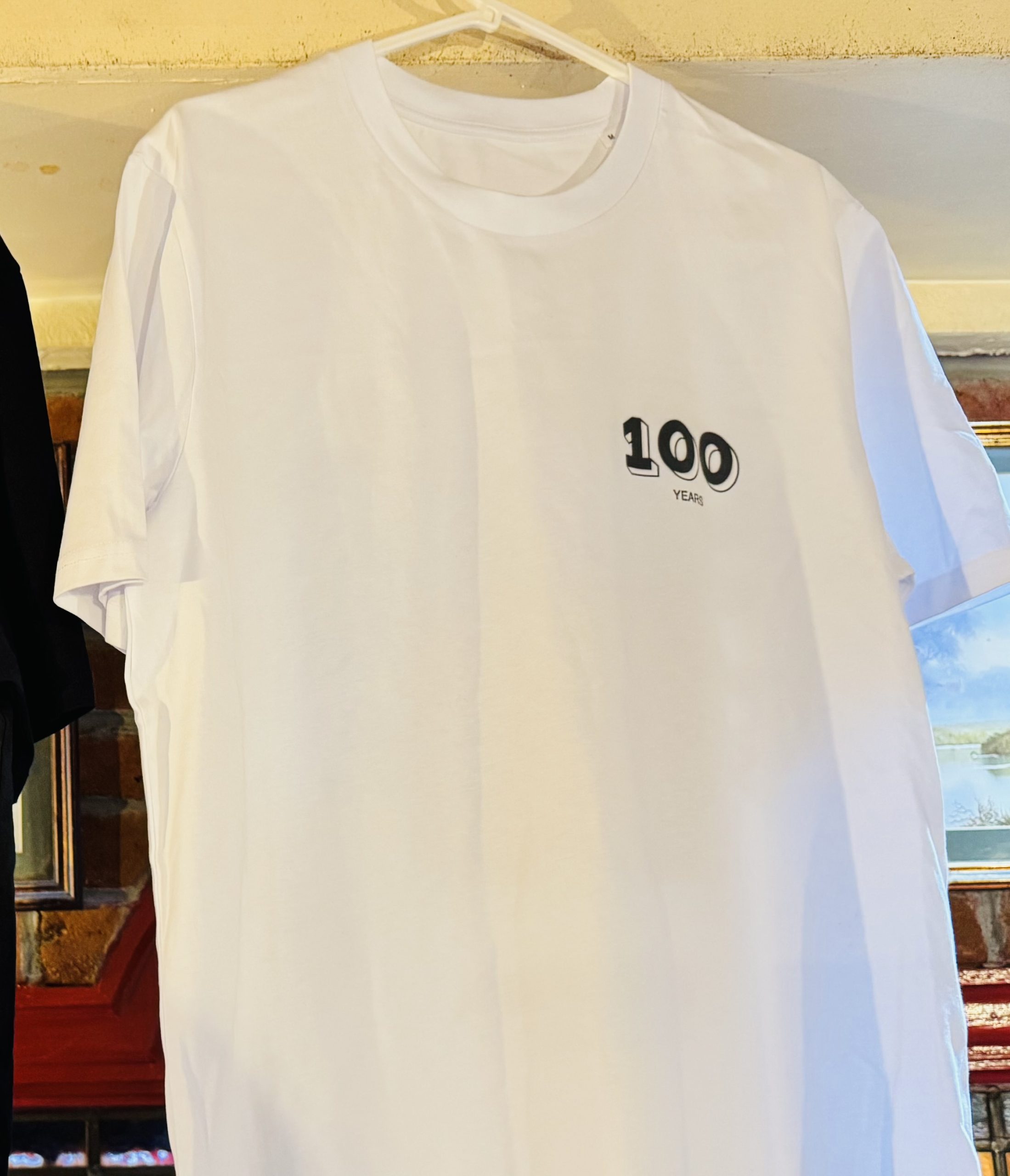 White 100 years T-Shirt with Front 1”00 years” print and “We’re still standing” print on back.